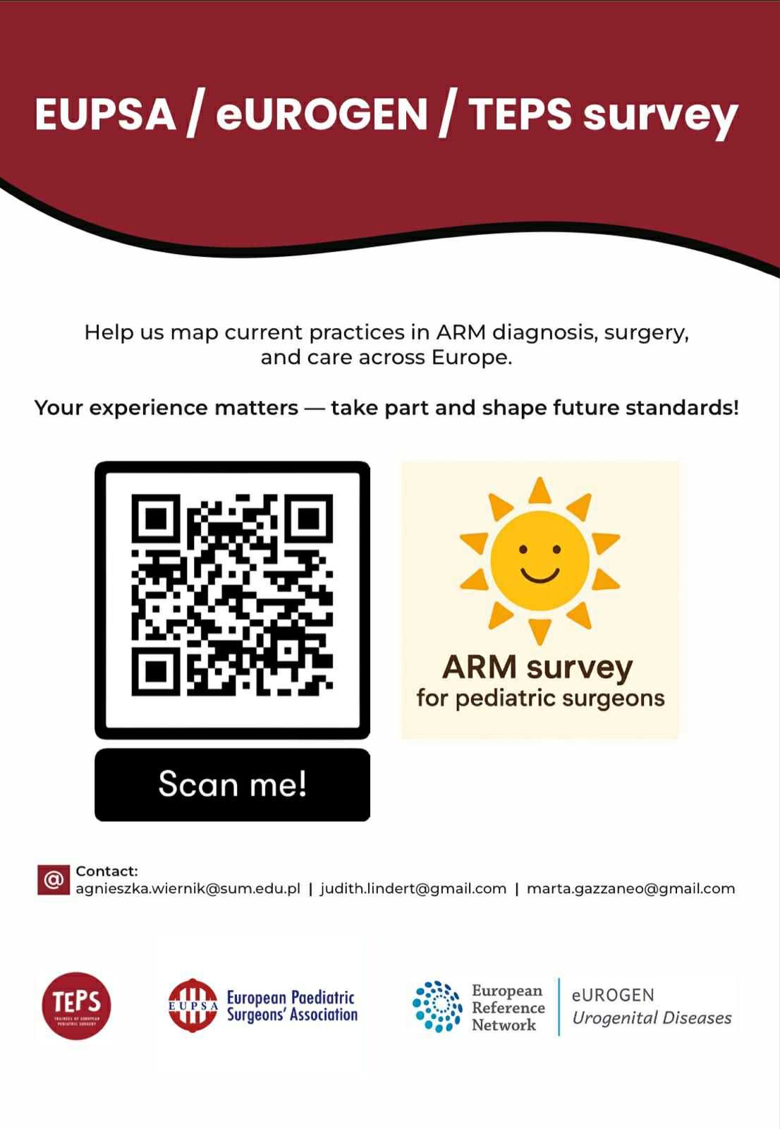 Egy fiatal lengyel kolléganőnk folytat kutatást az anorectalis malformatiok európai ellátásával kapcsolatban. Ha öt percet tudnátok szánni az időtökből a kérdőív kitöltésére, azt rendkívül nagyra értékelnénk. Ez egy hivatalos EUPSA-ERN-TEPS kérdőív, az eredményeinek lenne súlya. A kérdőívet már csak helyi vitaindítóként is érdemes elolvasni.